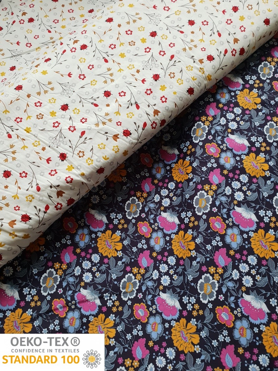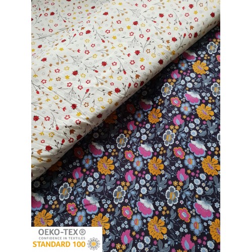 Popeline de coton Fleurs Ocre Rose Bleu marine