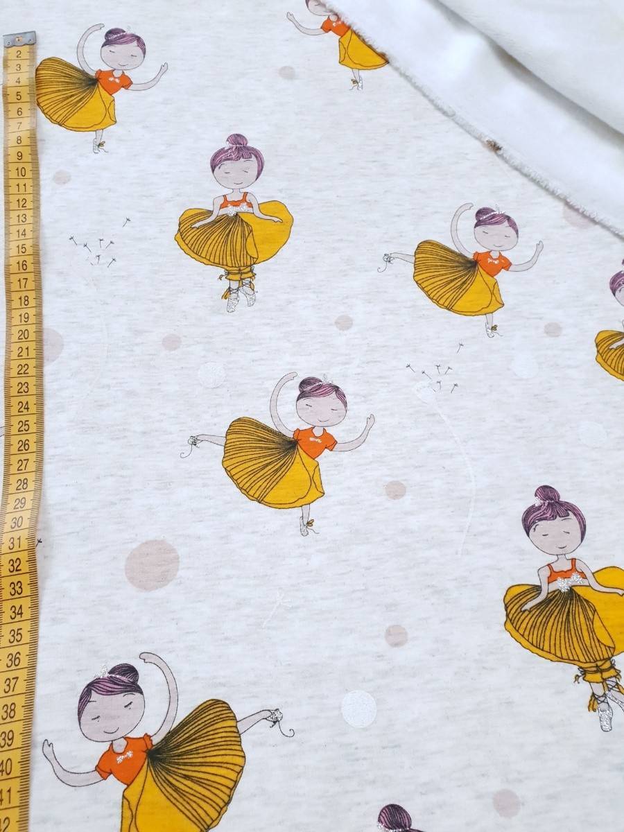 Sweat Minky Danseuses Ecru (détail : de jolies paillettes sur les ballerines, la robe et les cheveux de la danseuse)