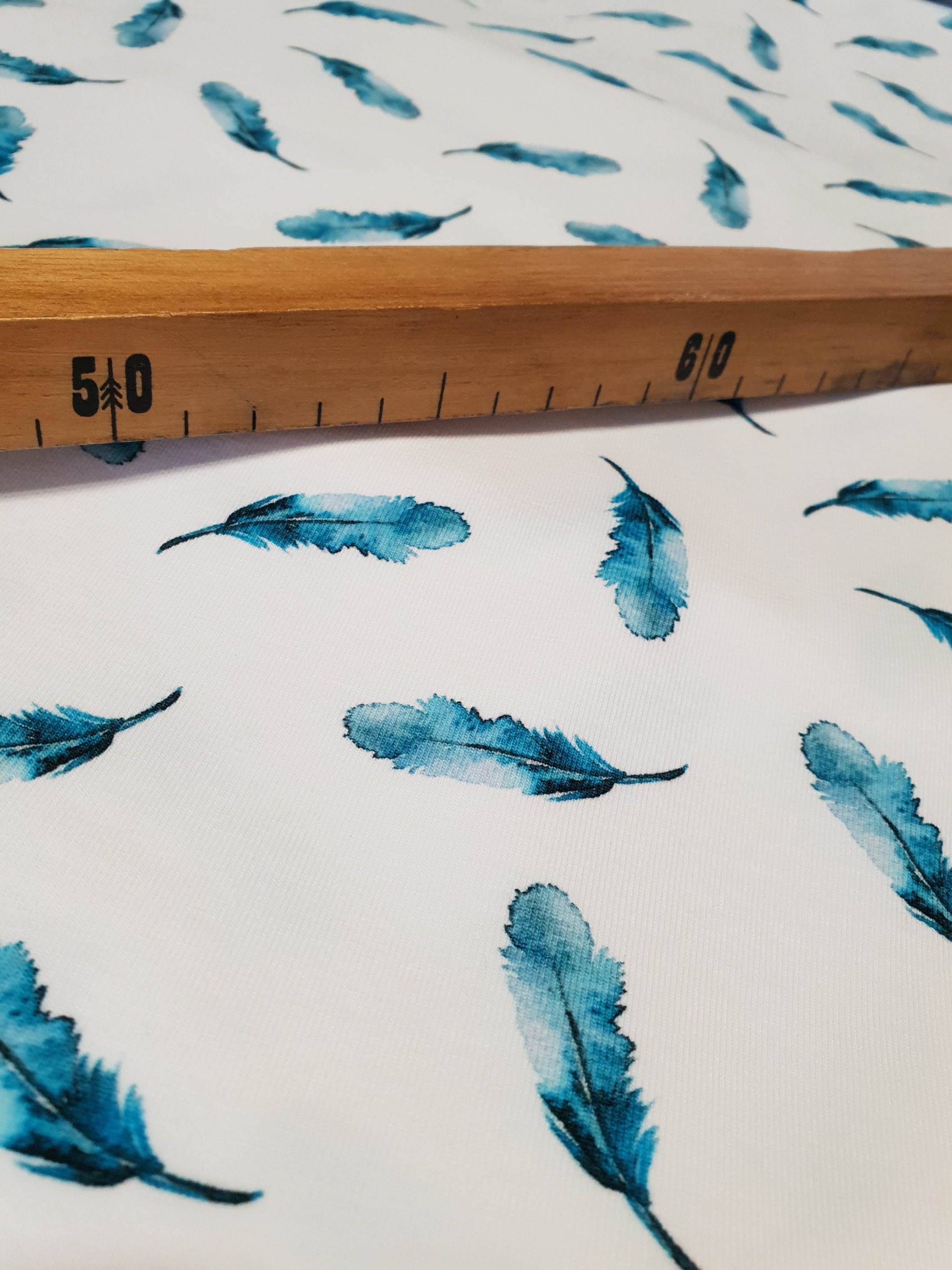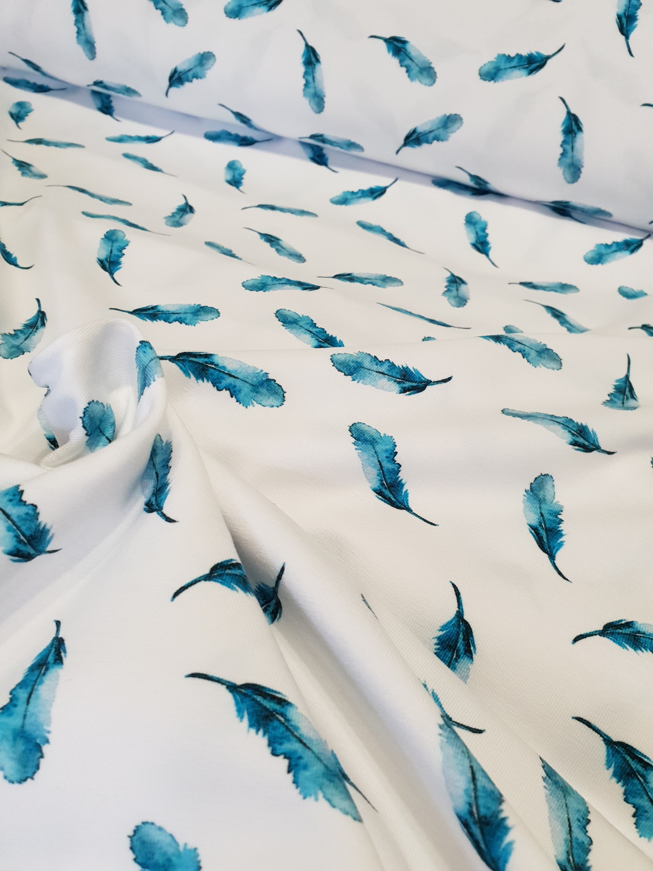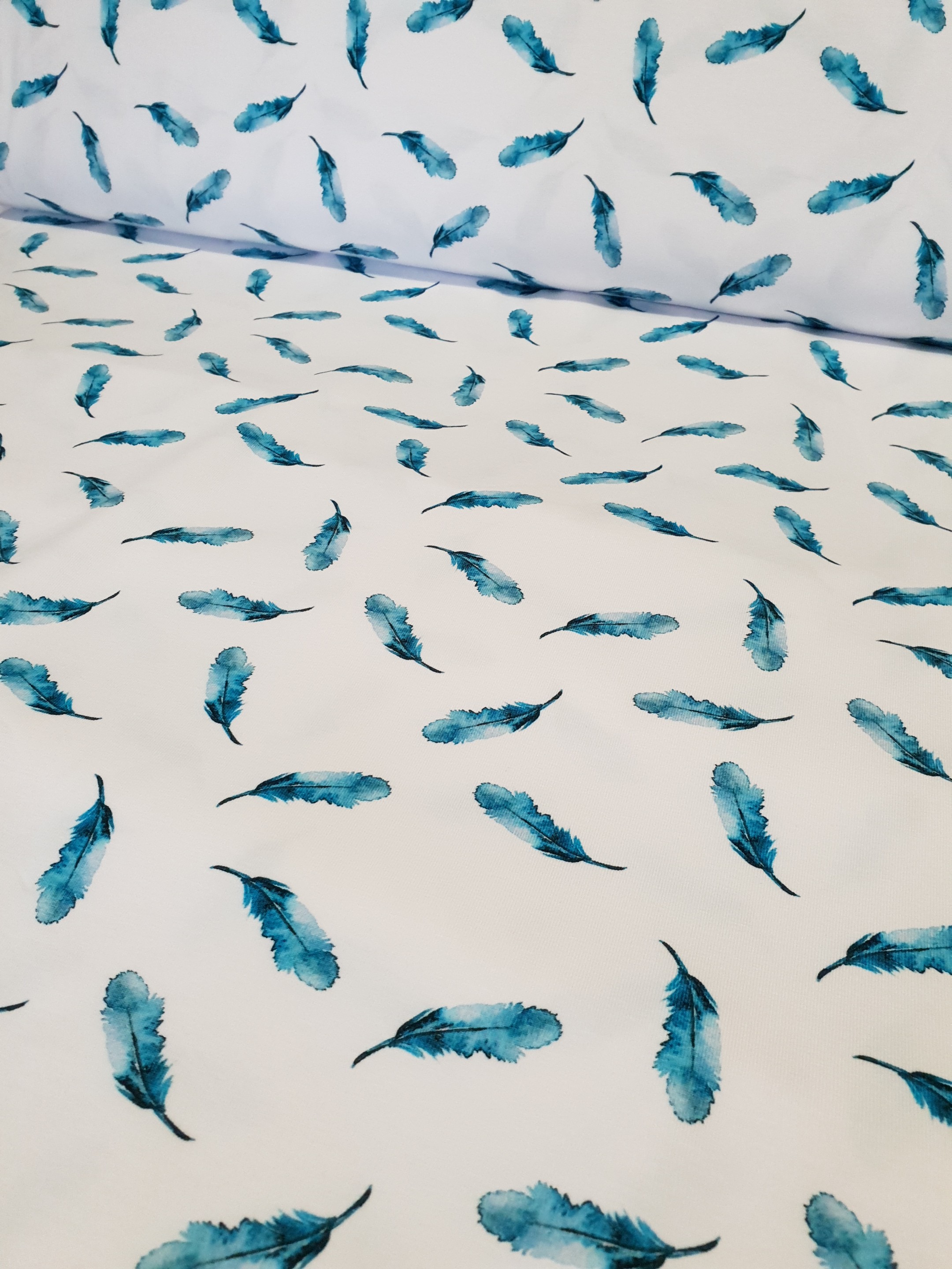 Jersey de Coton Bio imprimé Plumes bleues sur fond blanc