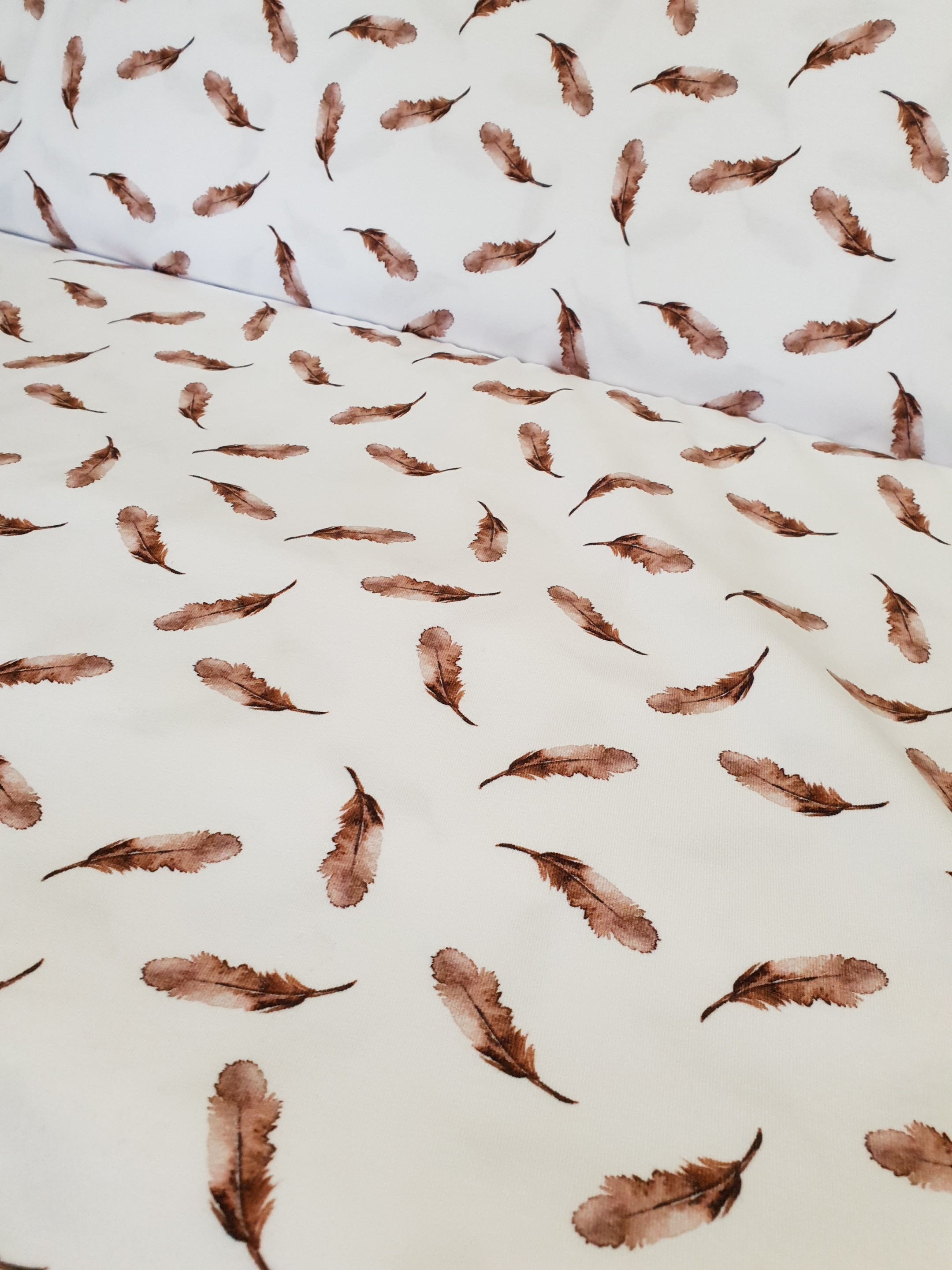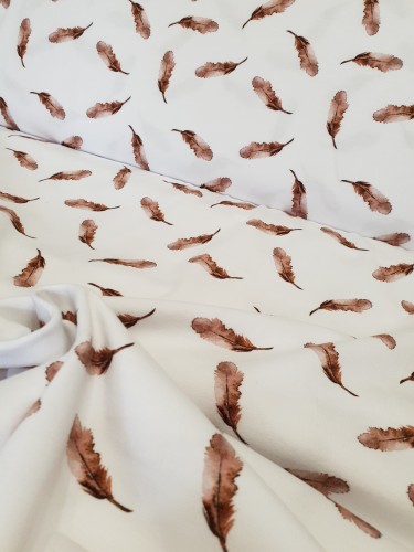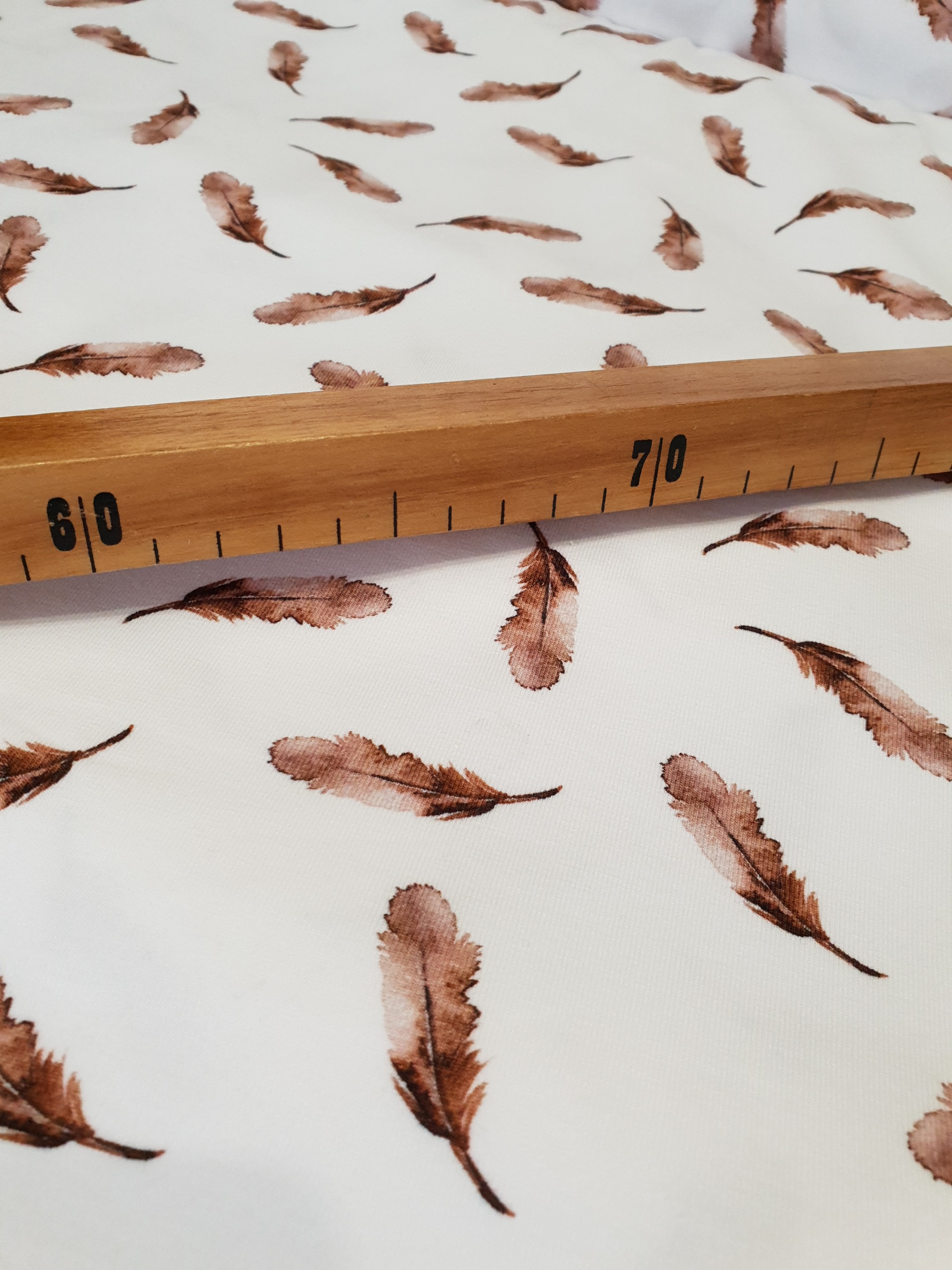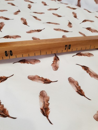 Jersey de Coton Bio imprimé Plumes camel sur fond blanc