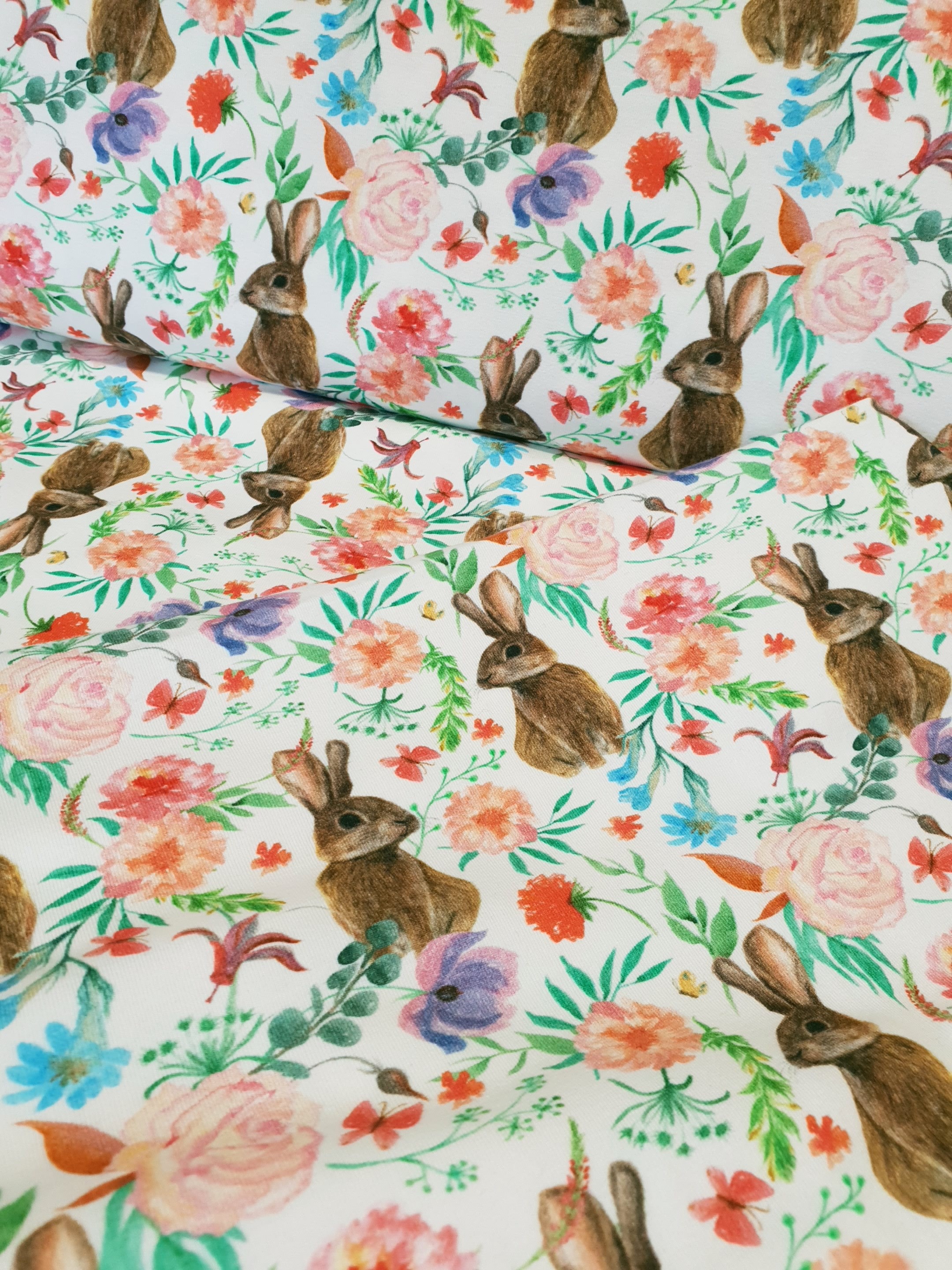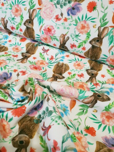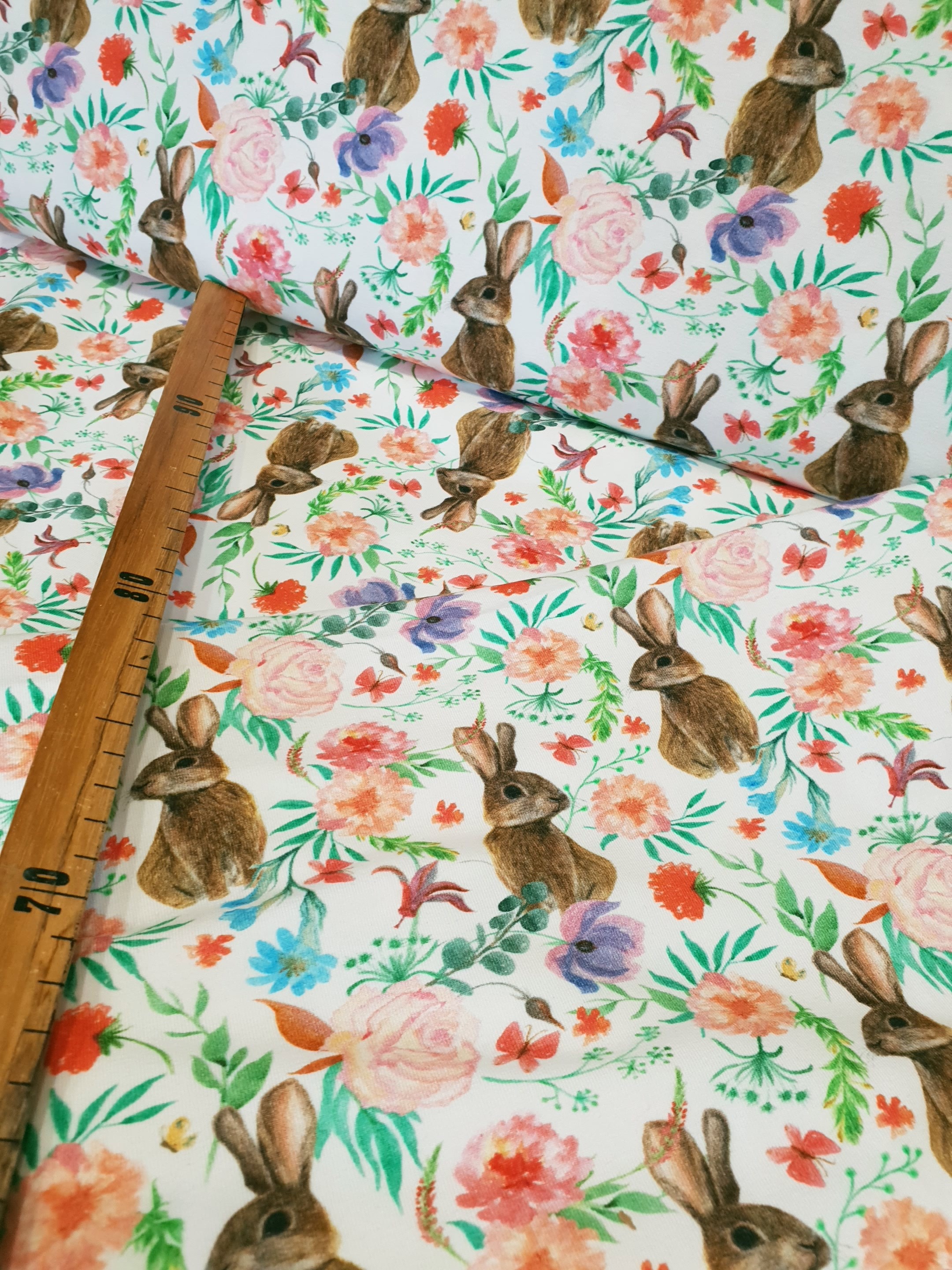 Jersey de Coton imprimé Lapin et fleurs sur fond blanc