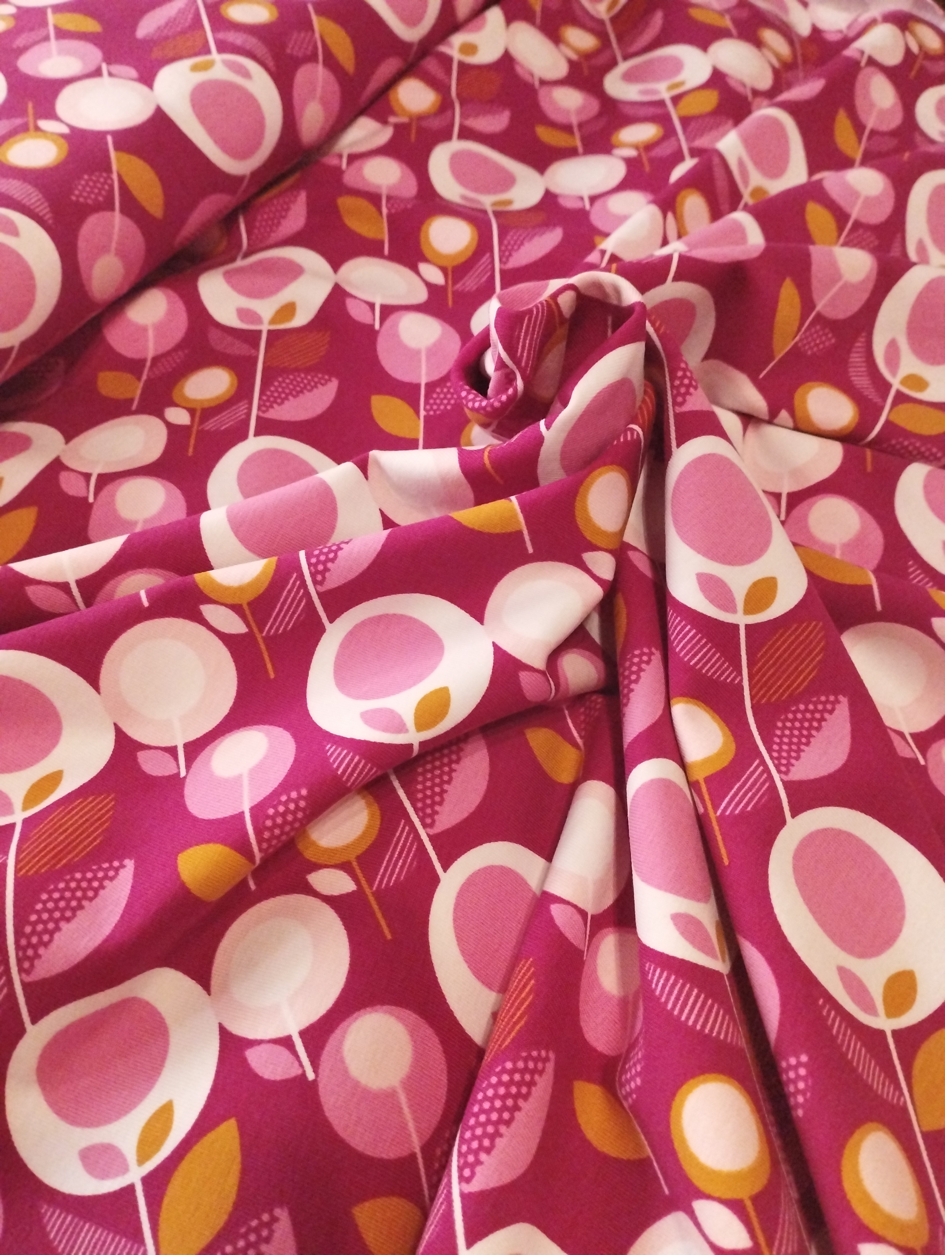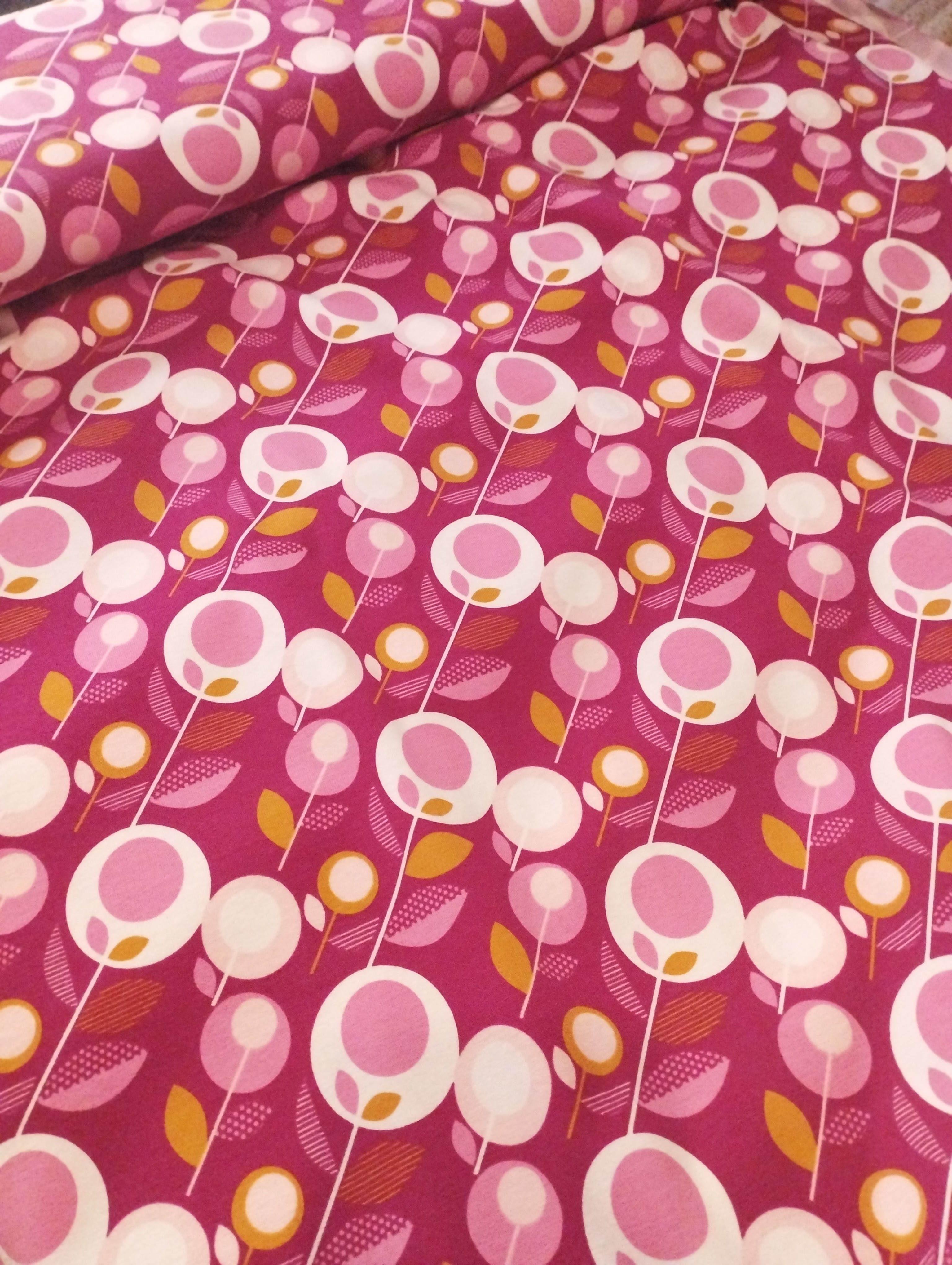 Jersey de Coton imprimé Fleurs Vintage rose, blanc et orange sur fond rose