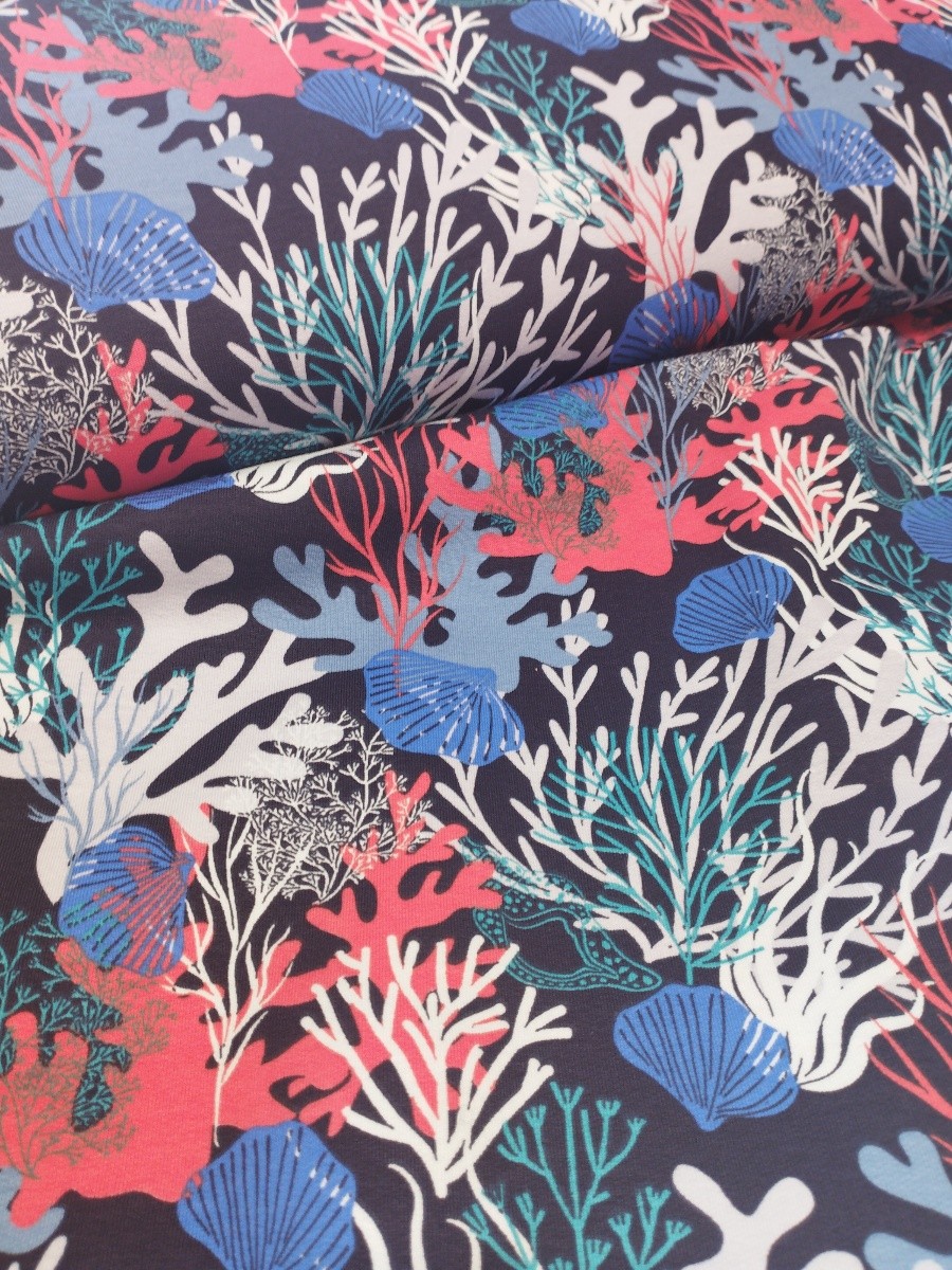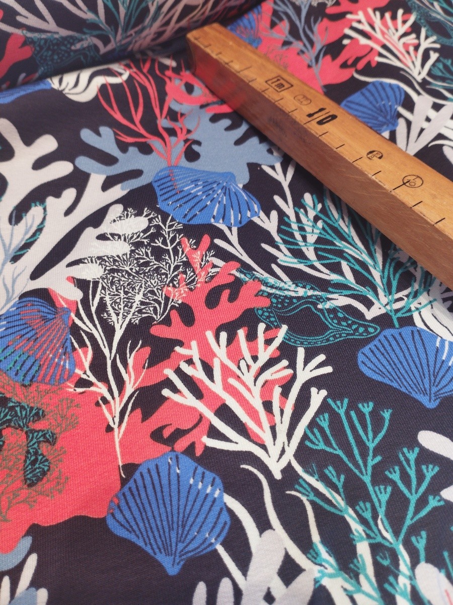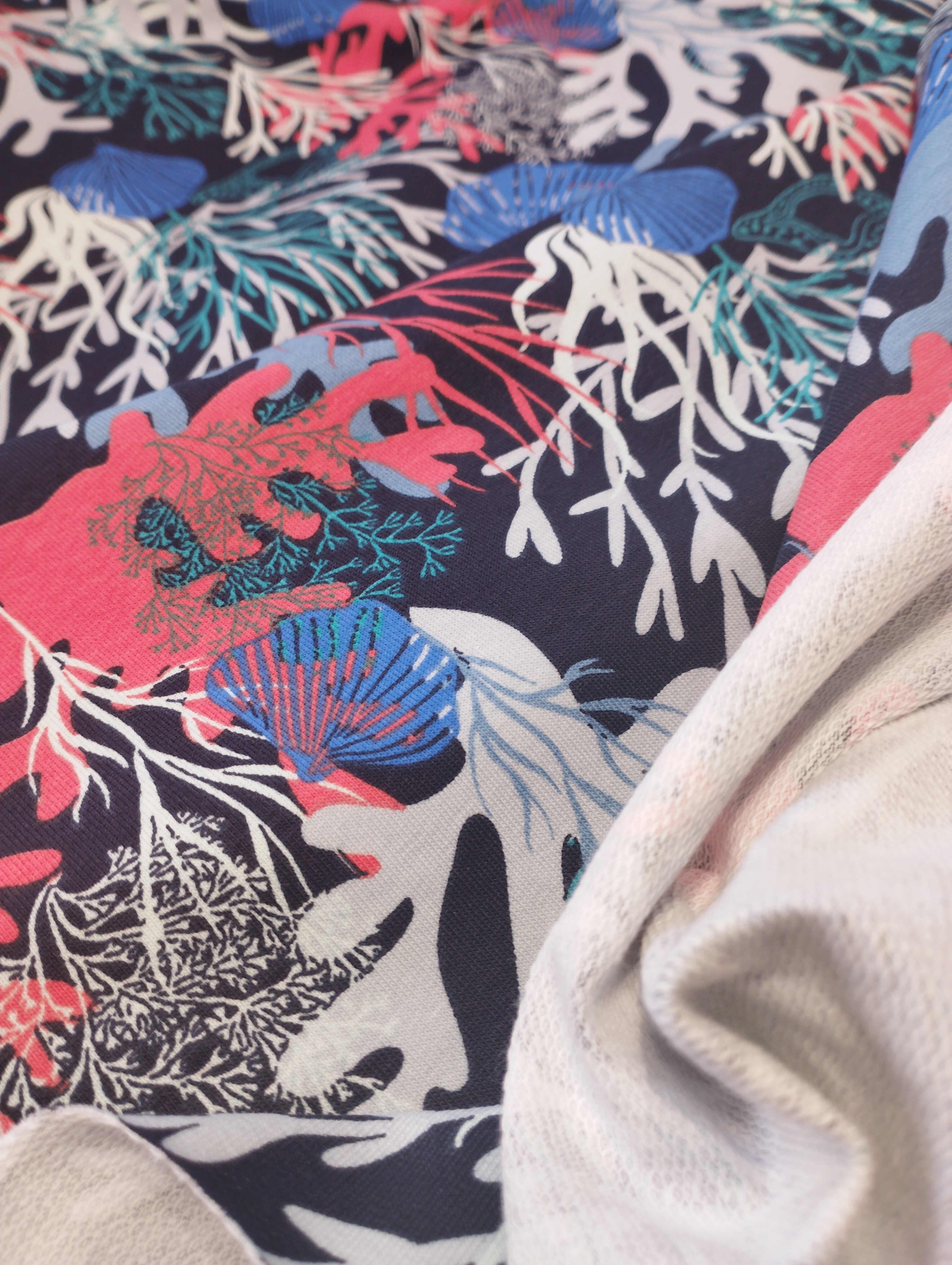 French Terry - Sweat bouclette imprimé Coraux corail, blanc et bleu sur fond Bleu nuit