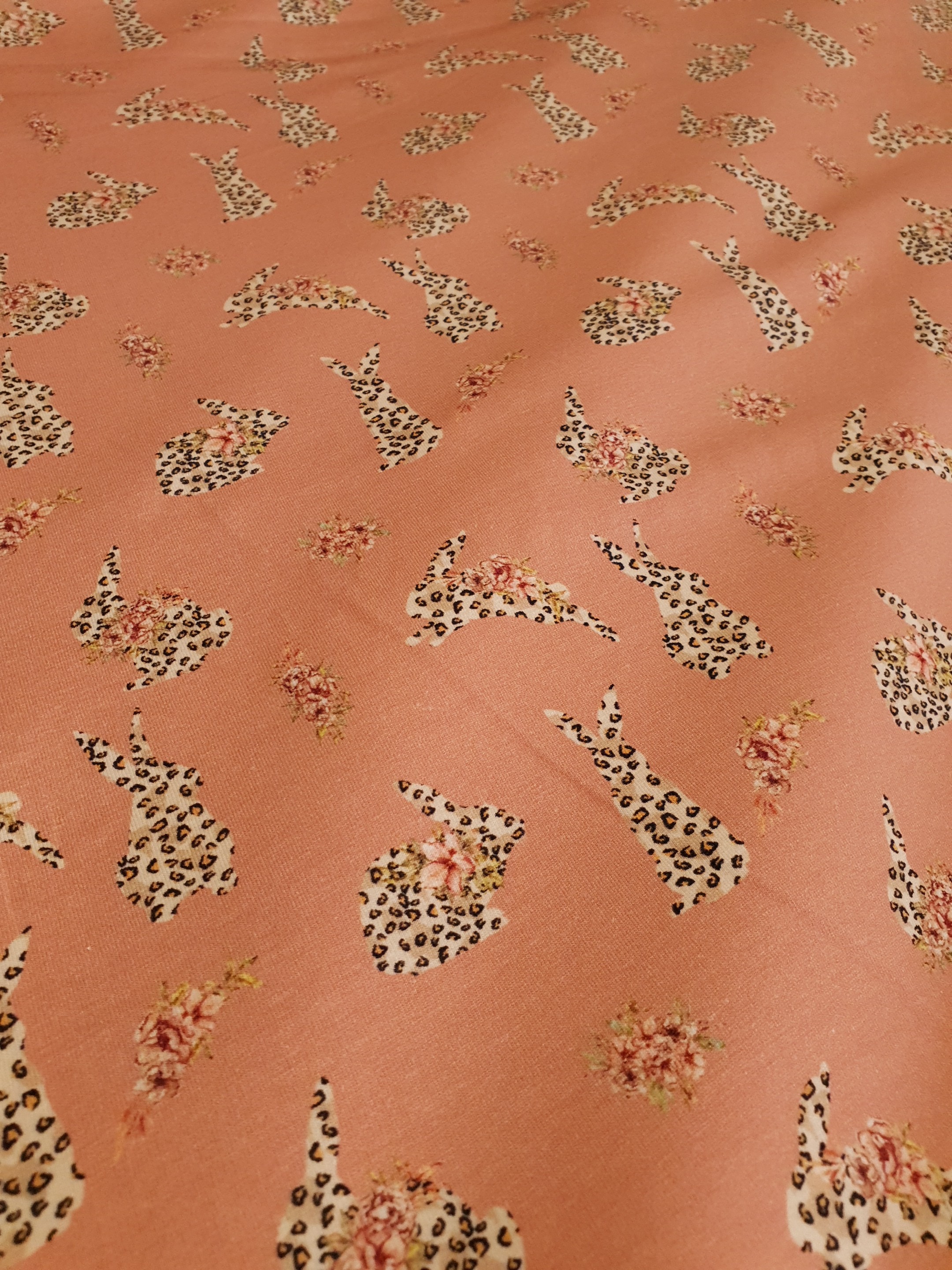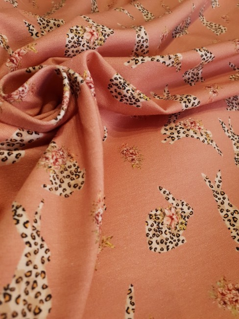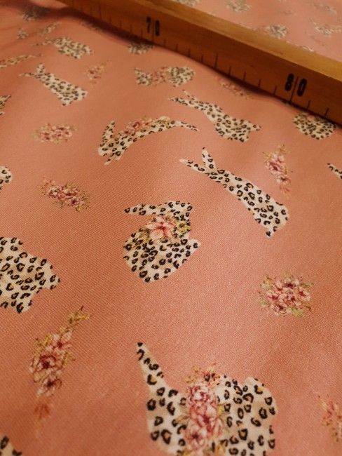 Jersey de Coton imprimé Lapins sur fond rose-orangé