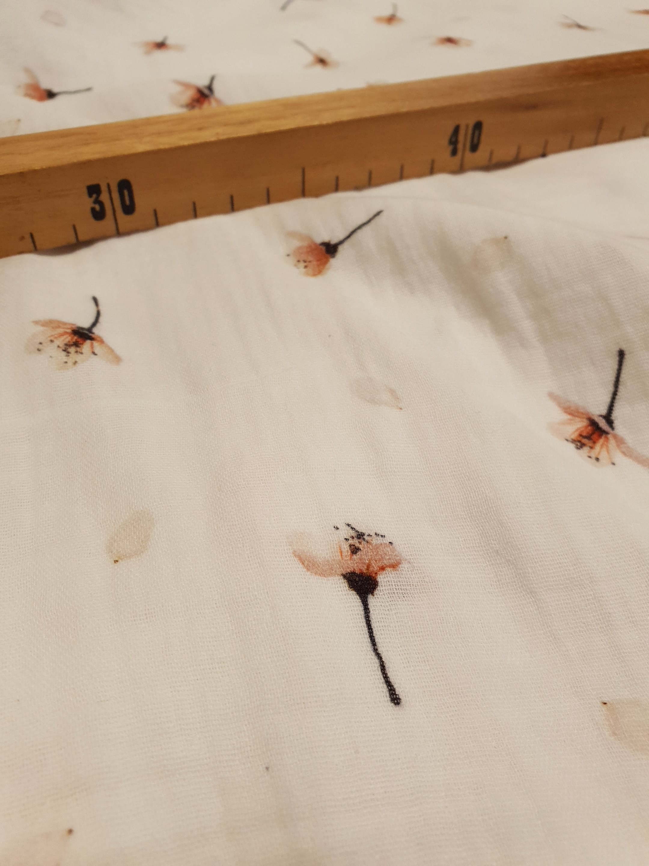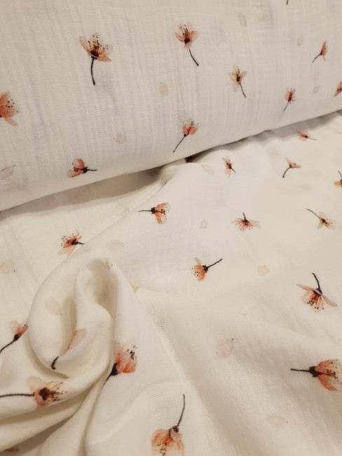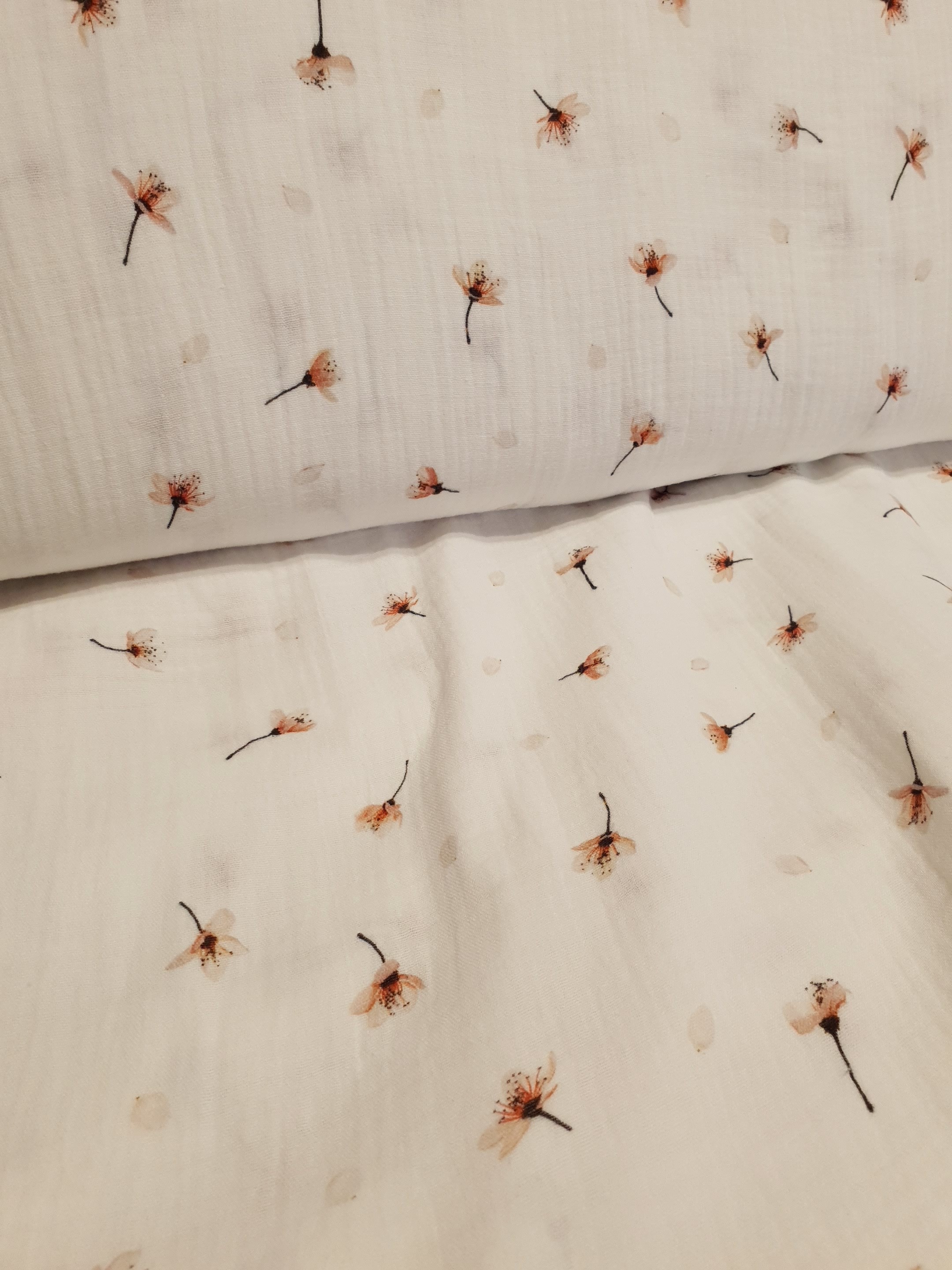 Double gaze imprimée Fleurs et Pétales sur fond Blanc