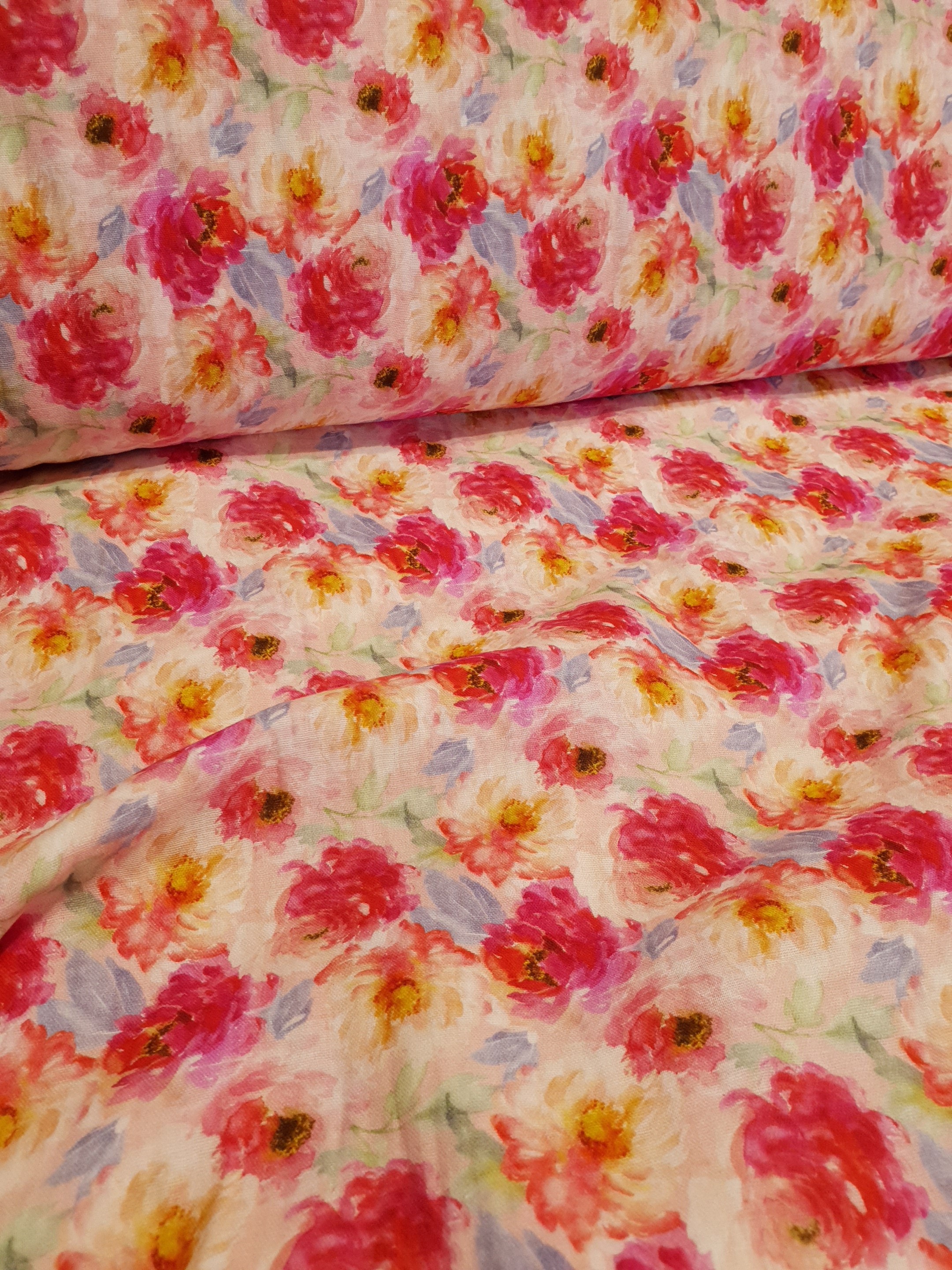 Double gaze imprimée Fleurs Rose, jaune, bleu sur fond Blanc