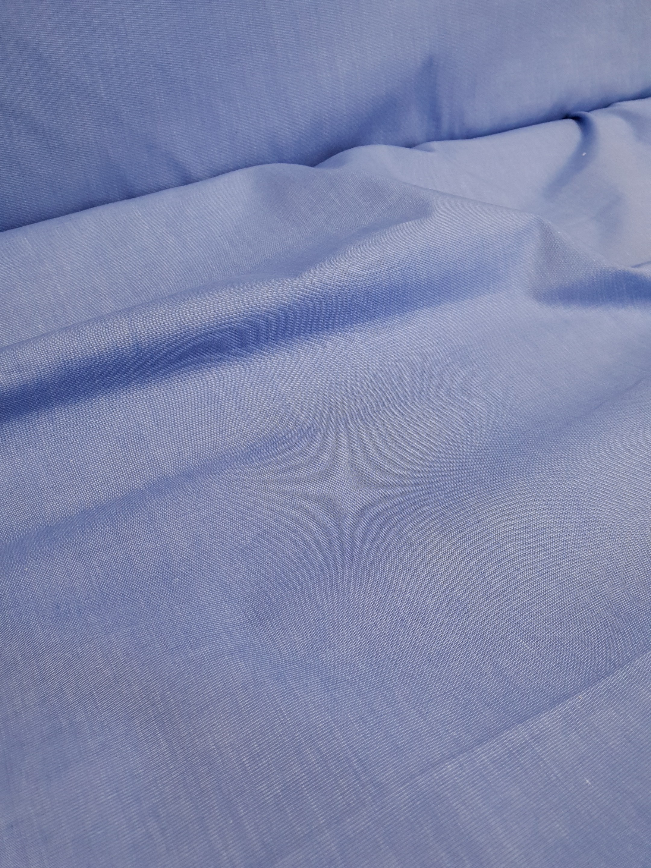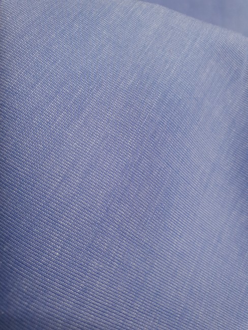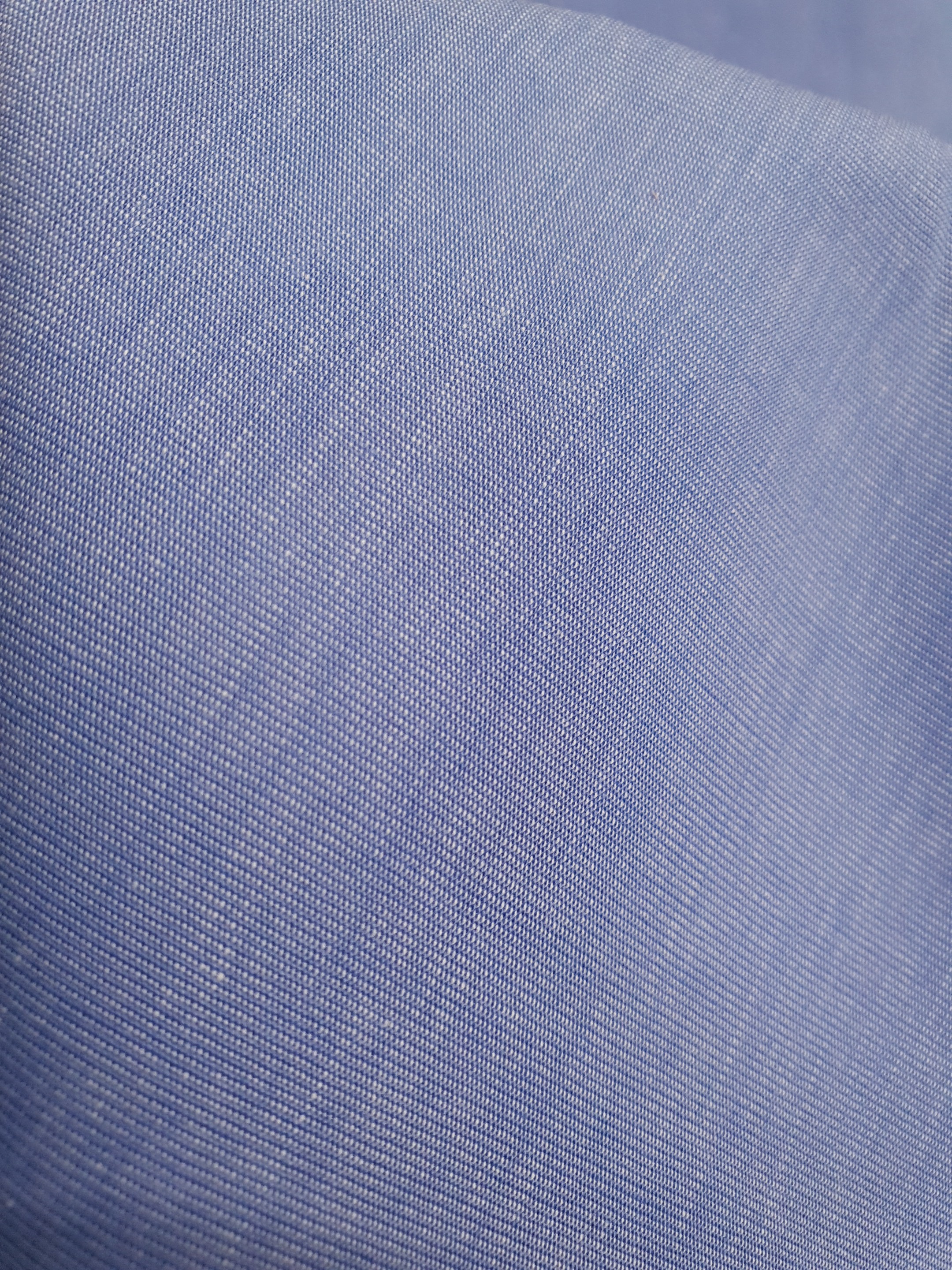 La popeline fil à fil est tissée avec des fils de couleurs différentes, ici fil de chaine bleu, et fil de trame blanc. C'est l'un des tissus les plus utilisés pour la confection de chemises.